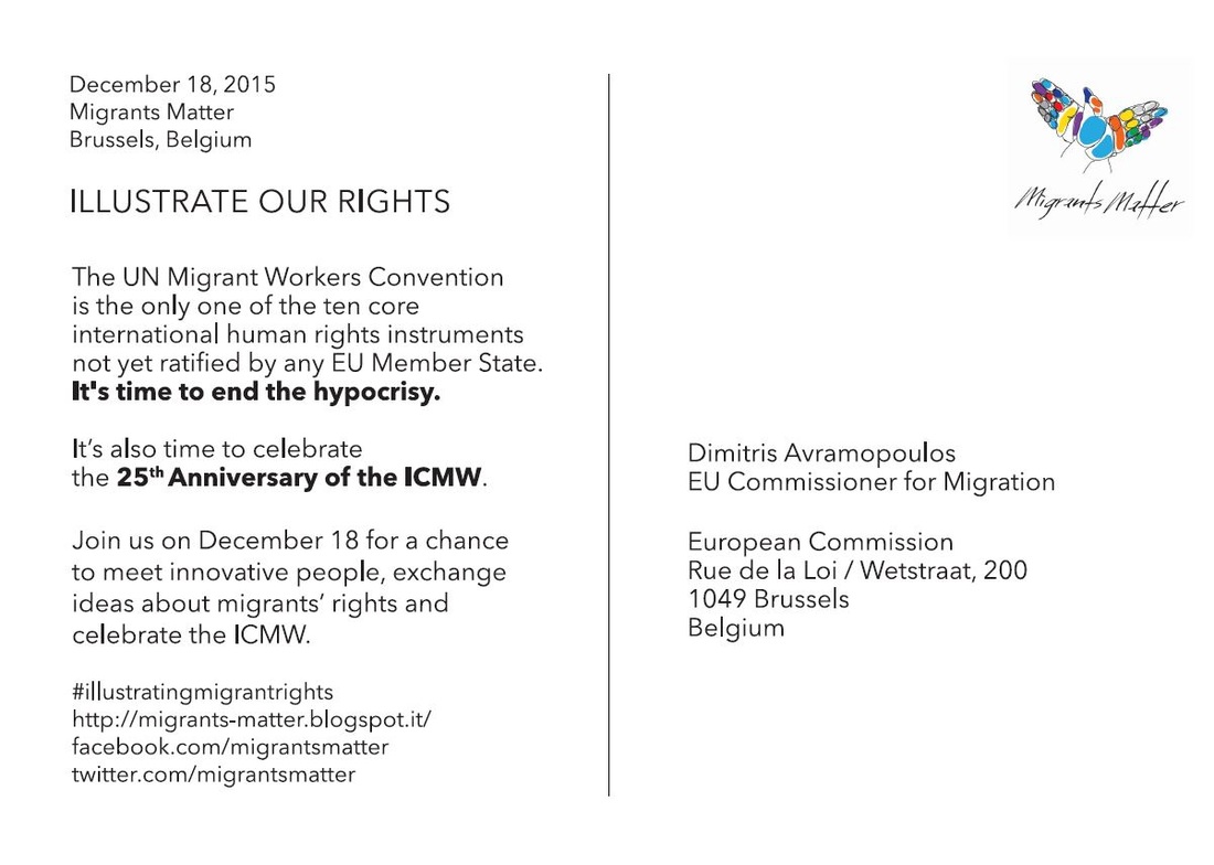 In 2015 we launched a postcard campaign (the first of a series) to call on the EU Commissioner for Migration, Home Affairs and Citizenship, to support ratification of the Convention in its 25th anniversary year.